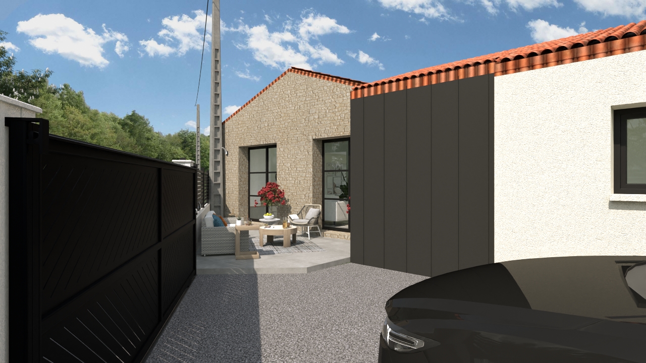 Situé en Vendée sur une parcelle de 500 m², ce projet mêle rénovation et extension dans une approche résolument architecturale. Il s’agit de la réhabilitation d’un bâti existant d’environ 40 m², complétée par une extension de 90 m².