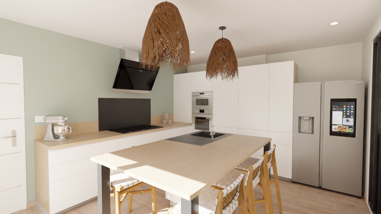 L’objectif était de réorganiser l’ensemble du rez-de-chaussée pour fluidifier la circulation et structurer un grand volume ouvert. Le projet propose une pièce de vie décloisonnée, tout en jouant sur le mobilier, les percées visuelles et les traitements au sol pour distinguer les fonctions : salon, séjour et cuisine trouvent chacun leur place sans cloison. L’ambiance intérieure repose sur des tons clairs et naturels, en accord avec le souhait des clients d’un cadre lumineux et rafraîchissant.