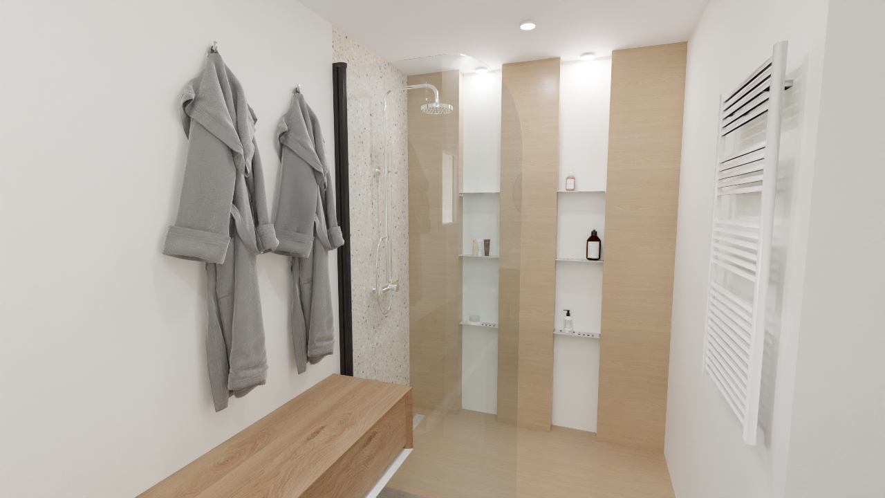 Réorganiser l’espace pour retrouver du confort et de la clarté était au cœur de cette intervention. La salle de bain d’origine, vieillissante et peu fonctionnelle, a été entièrement repensée : circulation modifiée, points d’eau déplacés, mobilier intégré.